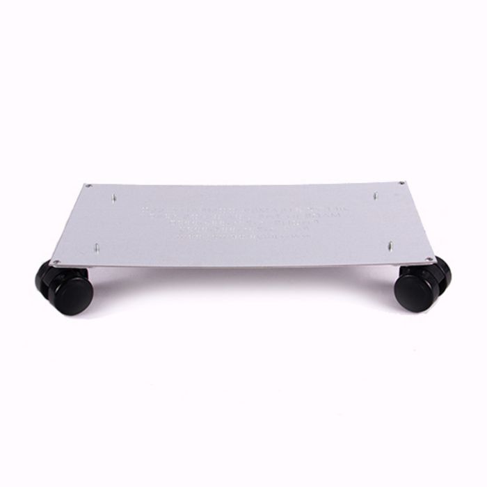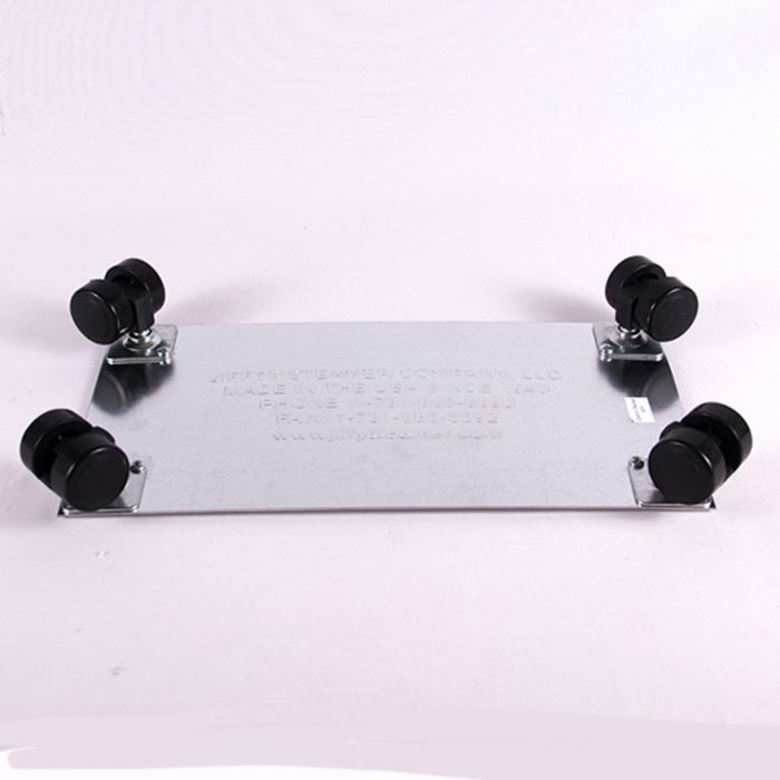 - This plate covers the bottom of the unit's housing and has four black wheels.